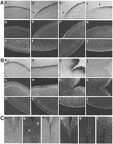 (a, d, g, and j) (arrowhead in a shows junction between hemispheres) and corresponding immunofluorescence for XAC (b and h) and actin (e and k). Immunofluorescence of vegetal hemisphere cortex stained for XAC (c and i) and actin (f and/) are also shown. (C)