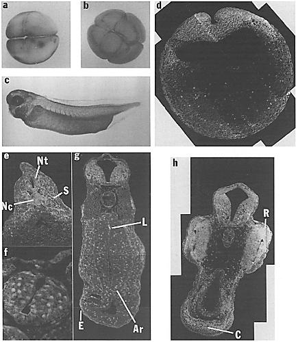 stained cells. (g) The neural tube, epidermis (E), cells lining the lumen of the archenteron (L), and a layer of cells within the archenteron