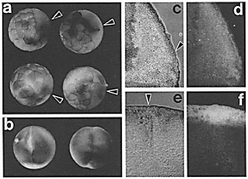 eggs (d-f), and zygotes 30 min after fertilization (g-/). Phase contrast micrographs showing the junction (arrowheads) between the animal