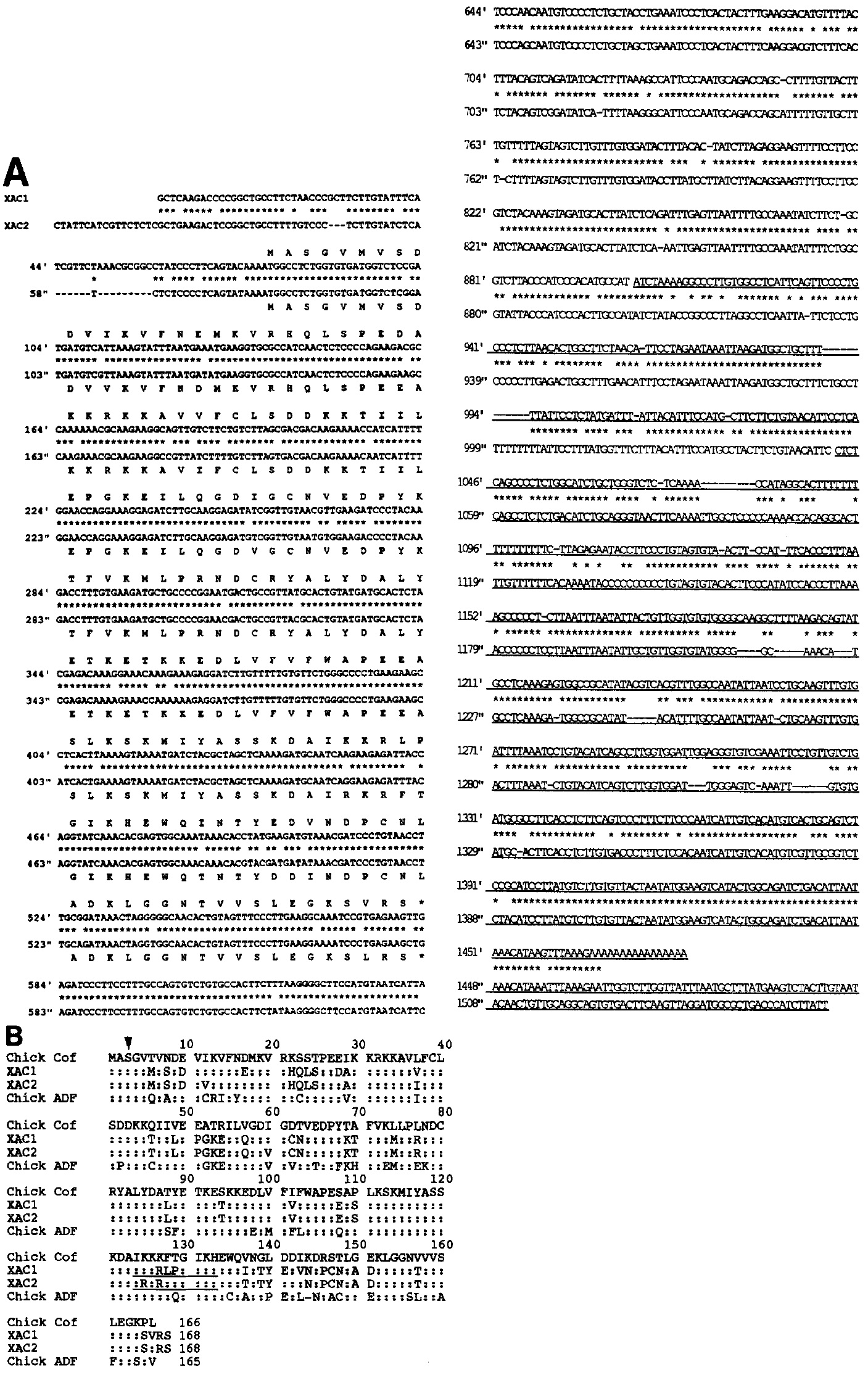 and U26269 (XAC2). (B) Comparison of the XAC1 and XAC2 protein sequences to those of chicken cofilin and ADF. The regulatory