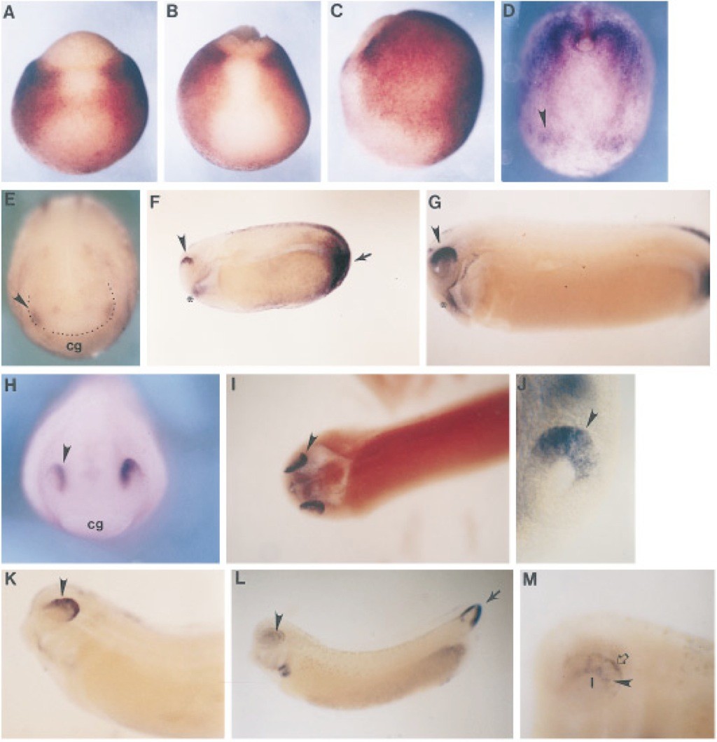 FIG. 2. Whole mount in situ hybridization showing expression of Xbr-1 during development. In panels D Xbr-1 expression in the eye anlage is marked with an arrowhead. (A, B) Xbr-1 expression of stages 10.5 and 11.5 gastrulae. Shown are dorsal views and the closing blastopore is at the top. Xbr-1 is not expressed on the dorsal side. (C) Lateral view of the embryo in (B), showing that Xbr-1 expression is strong on the ventral side of the gastrula. At mid-gastrulation (stage 11.5, B), the Xbr-1 negative area has a keyhole shape, i.e., it is narrow posteriorly and flares out anteriorly. Based on its location on the dorsal side we suggest that the area that does not express Xbr-1 at stage 10.5 corresponds to the prospective neural plate. However, the fate map of the early gastrula shows that the prospective neural plate is much larger and it extends well to the lateral sides of the gastrula (Keller et al., 1992). Therefore, it is likely that the Xbr-1-negative region covers only part of the neural plate, possibly the ventral neural tube and/or the floor plate posteriorly and the prospective forebrain anteriorly. (D) Dorsal-anterior view of Xbr-1 expression at late gastrula/early neurula stage (stage 13). The remnant of the blastopore is to the top and the prospective anterior neural plate to the bottom of the figure. The color reaction has been purposely overdeveloped to reveal the bilateral Xbr1 staining in the anterior neural plate, in the area of the prospective eyes. (E) Anterior view of Xbr-1 expression at the neural plate stage (stage 16). Xbr-1 is expressed in the dorsal eye anlage in the anterior-lateral neural plate. The dotted line defines the limits of the anterior neural plate. (F, G) Side views of Xbr-1 expression at stage 25 (F) and stage 26 (G). Arrow in F points to Xbr-1 expression in the tailbud, asterisk to expression in the pharynx. (H, I) Frontal (H) and dorsal (I) views of stage 27 embryos, showing strong expression in the eye. (J) High magnification of a stage 25/26 eye. Xbr-1 expression is restricted to the dorsal half. (K, L) Side views of stage 30 (K) and stage 33/34 (L) embryos. Arrow in L points to the tailbud. At stage 33/34 the hybridization signal in the eye is obscured by eye pigment. However, in high magnification (M) of the eye region the bluish hybridization signal of Xbr-1 expression (arrowhead) can be distinguished from the brown eye pigment (open arrow). The position of the lens is marked (l). Expression of Xbr-1 is still found only in the dorsal half of the eye but it is more restricted than earlier (compare with M). Abbreviations: cg, cement gland; l, lens.