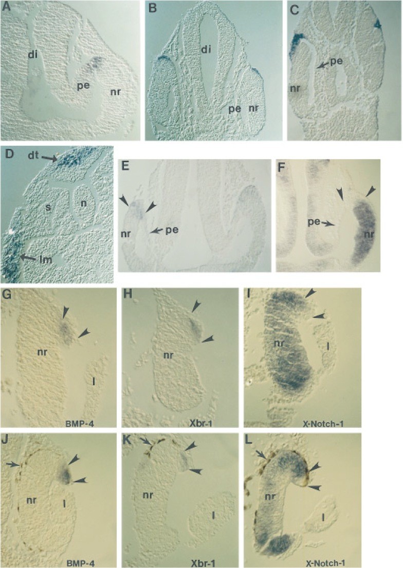 FIG. 3. Sections showing expression of Xbr-1, BMP-4, and X-Notch-1 during eye development, after whole-mount in situ hybridization. (A, B, C, D, E, H, K) Expression of Xbr-1 (I, L), expression of X-Notch-1 (G, J), and expression of BMP-4. (A, B, C) Transverse sections at the levels of the eyes at stage 25 (A), stage 26 (B), and stage 278 (C). Expression is found in the area between the prospective neural retina and the pigment epithelium (A) and ends up in the margin of the eye (C). Note that the pigment epithelium thins out during development (from A to C) and eventually envelops the back of the neural retina (arrows in J, K, L). (D) Posterior transverse section of a stage 25 embryo showing expression of Xbr-1 in the dorsal neural tube (dt) and the lateral mesoderm (lm). (E, F) Comparison of Xbr-1 and X-Notch-1 expression in the eyes at stage 25/26. The area between arrowheads expresses Xbr-1 (E) but not X-Notch-1 (G). Note that at this stage X-Notch-1 is expressed uniformly in the prospective neural retina. (G, H, I, J, K, L) High magnification of sections through the eyes, showing a comparison between expression of BMP-4 (G, J), Xbr-1 (H, K), and X-Notch-1 (I, L) at stage 31/32 (G, H, I) and stage 33/34 (J, K, L). The area of the eye that expresses Xbr-1 (H, K) and BMP-4 (G, J) is the part of the prospective dorsal ciliary margin and is included between arrowheads. These sections show that expression of BMP-4 and Xbr-1 in the eye is largely coincident at both stages. The same area of the eye appears negative for X-Notch-1 expression (area between arrowheads in I, L). Note that as the neural retina differentiates, between stages 312 (I) and 33/34 (L), X-Notch-1 expression becomes gradually restricted to the periphery of the eye, but is never observed at the very edge of the eye (arrowheads). In (G, H, I) the prospective pigment epithelium has thinned out and cannot be easily distinguished. In (J, K, L) arrows point to the pigment epithelium which is now easily recognizable by the brown pigment. In some sections the lens (l) has been detached. Abbreviations: di, diencephalon; dt, dorsal neural tube; l, lens; lm, lateral mesoderm; n, notochord; nr, prospective neural retina; pe, prospective pigment epithelium; s, somite.
