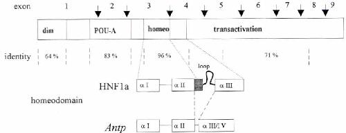 the two homeodomains are aligned. The 21 amino acid loop specific for the HNFla homeodomain is located partla/{y in helix all (shaded area).