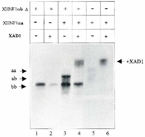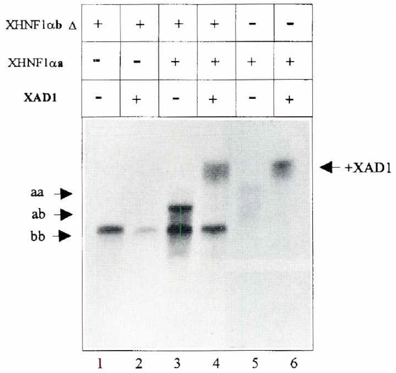 Fig. 3. XHNF1ua and XHNF1r1b form heterodimers. A gel retardation