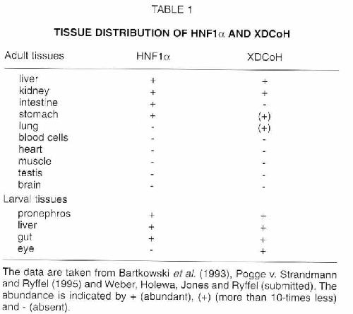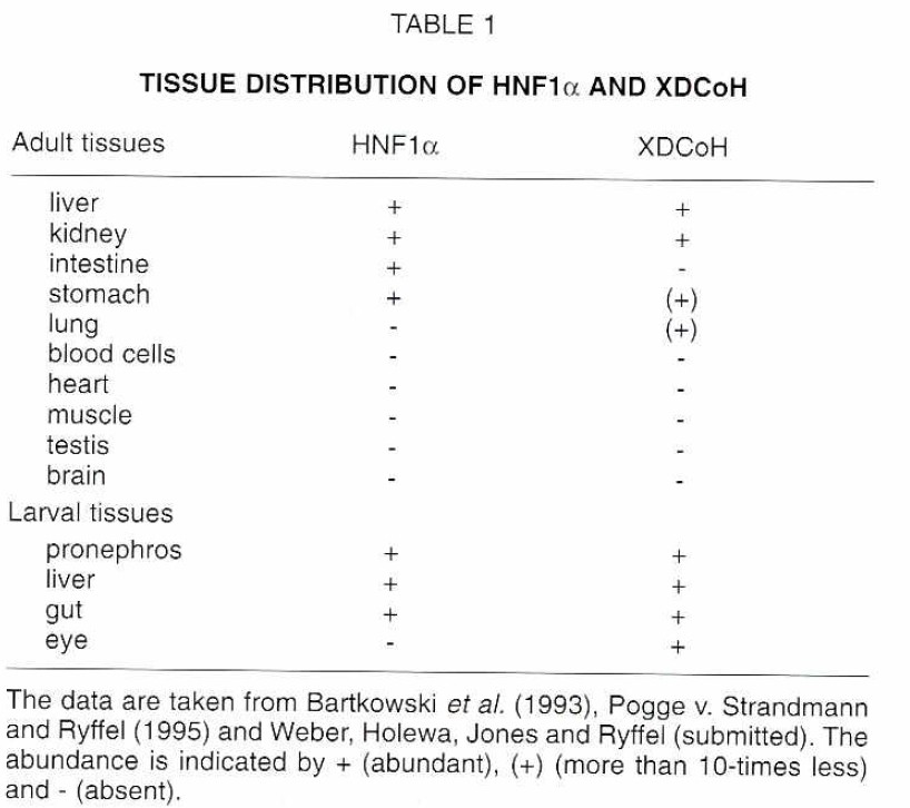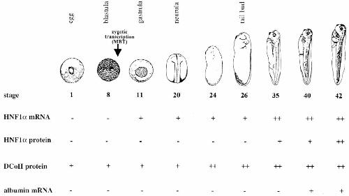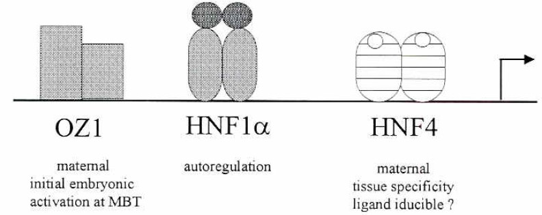 We review the data available on the structure, developmental appearance and embryonic regulation of the tissue-specific transcription factor HNF1 alpha (LFB1) in Xenopus. The expression of the HNF1 alpha gene starts early in embryogenesis shortly after mid-blastula transition and the protein accumulates in the region of the embryo where liver, pronephros and gut--tissues that contain HNF1 alpha in the adult--are developing. The cofactor DCoH, known to stabilize dimer formation of HNF1 alpha, is present as a maternal factor in the egg and has a partially distinct tissue distribution compared to HNF1 alpha. This implies that DCoH does not only modulate HNF1 alpha dimerization but may also cooperate with other transcription factors. By injecting HNF1 alpha promoter CAT constructs into fertilized Xenopus eggs we obtained activation of the injected gene restricted to the region of the developing larvae expressing endogenous HNF1 alpha. Deletion analysis allowed to define the OZ-element that is essential for embryonic activation. This element also occurs in other promoters activated at mid-blastula transition in the embryo and interacts with the maternal factor OZ-1. As the HNF1 alpha promoter also contains functional binding sites for HNF4 and HNF1, we postulate that all of these transcription factors contribute to the cascade leading to proper embryonic activation of the HNF1 alpha gene.
