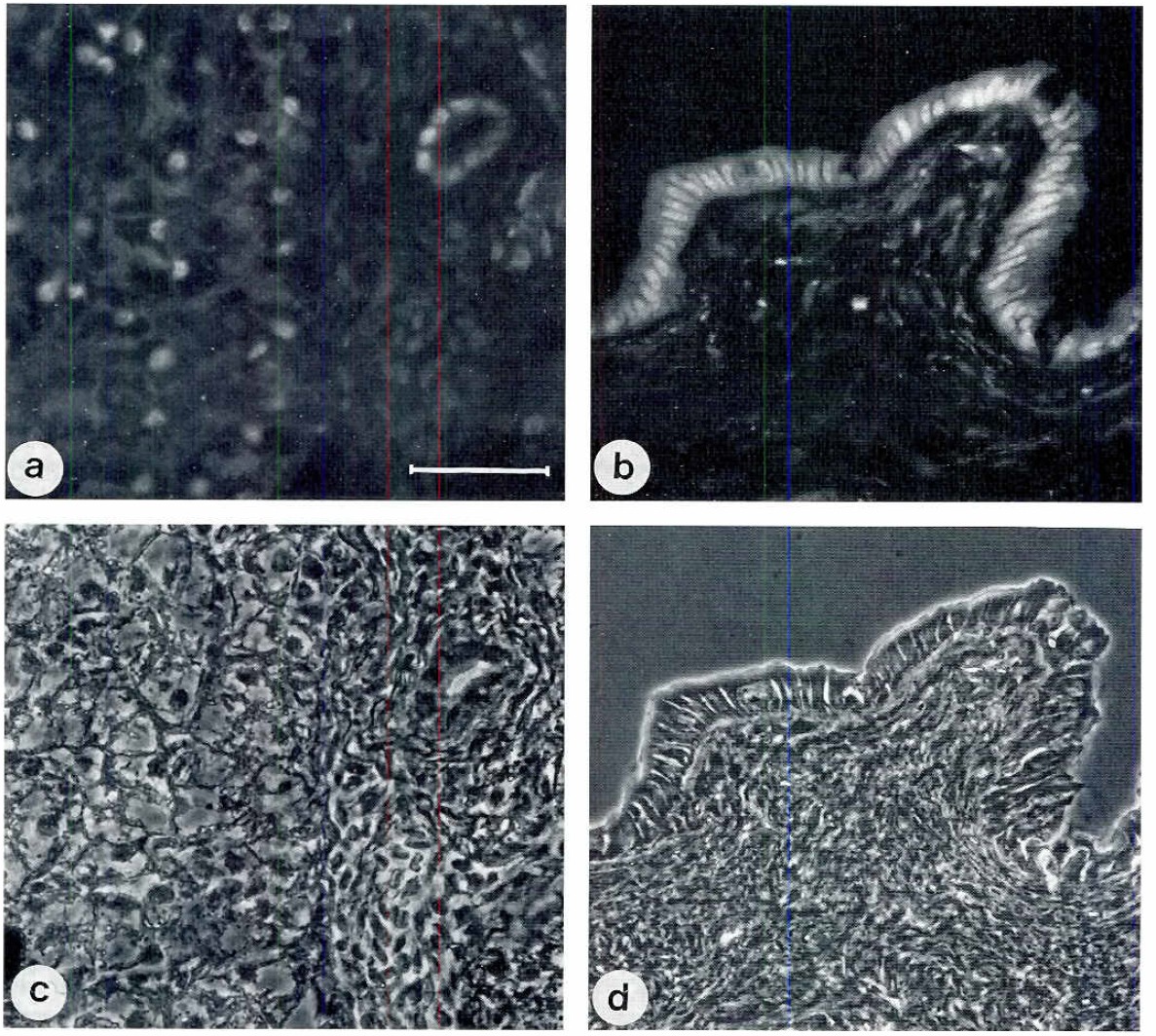 Fig. 5. Immunostaining of liver and gut sections of adult Xenopus to locate HNF1a. Cryostat sections of the liver (a) and the gut (b) were immunostained with the HNF1a specific monoclonal antibody XAD5 (Bartkowski et al., 1993) as first antibody and the Cy3-conjugated rat anti-mouse IgG as second antibody. The corresponding phase contrast pictures are in panel c and d. The magnification in all panels is the same; bar. 100 um.