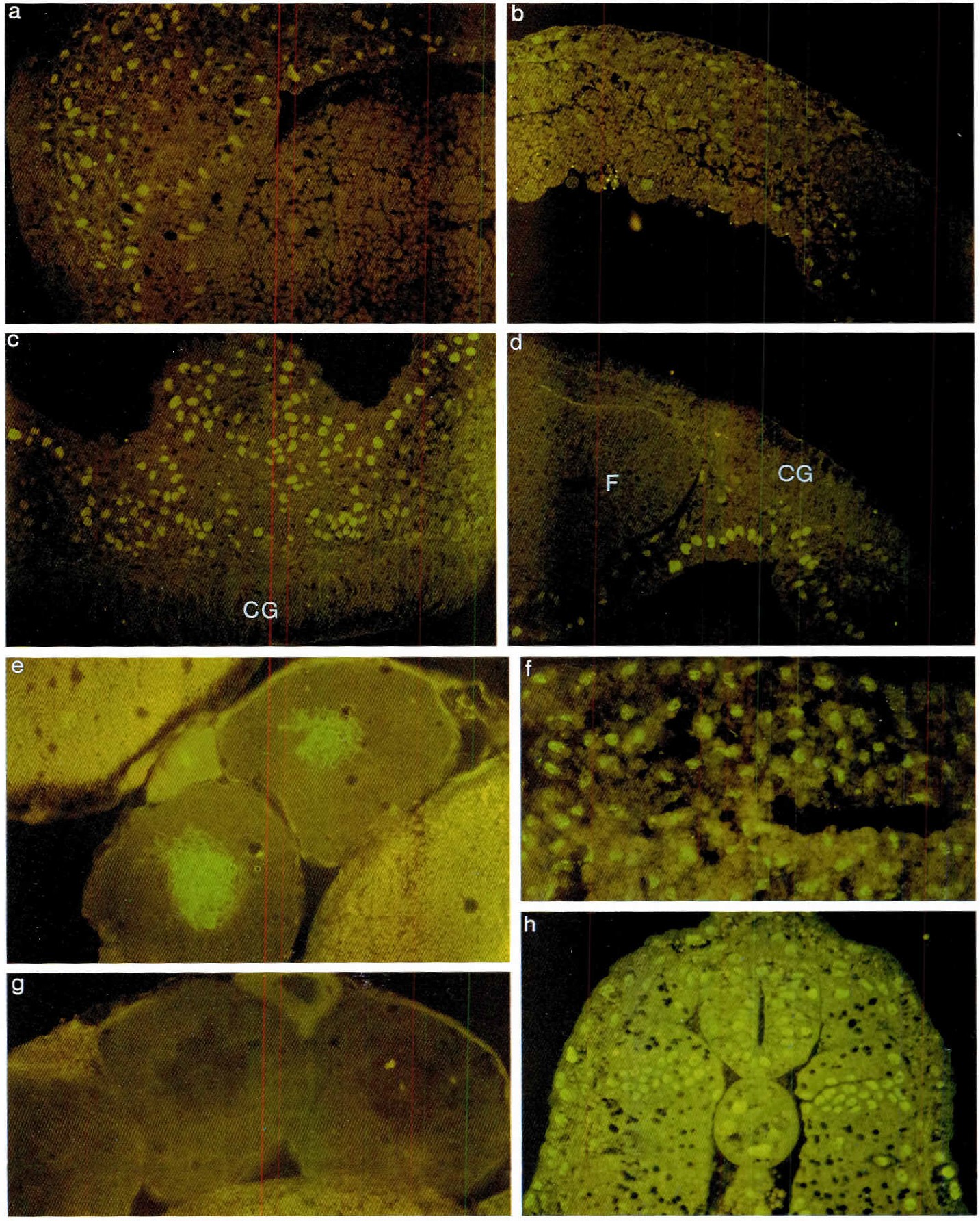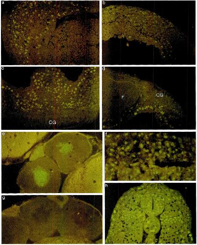 the forebrain (F)and the cement gland (CG).Anterior is to the right in (a,b,d!. Ie-g) Staining of frozen sections with anti-xPPARj3(e,f), or preimmune