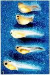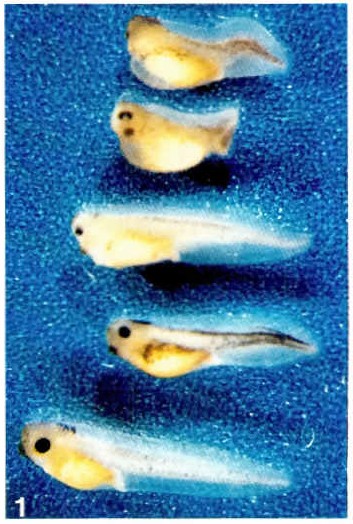 Fig. 1. Treatment of embryos with retinoic acid. Phenotypes observed in tadpoles after treatment of embryos at the blastula stage 9 with a 30 min pulse of 10-6M all-trans-RA. The untreated control is shown at the bottom