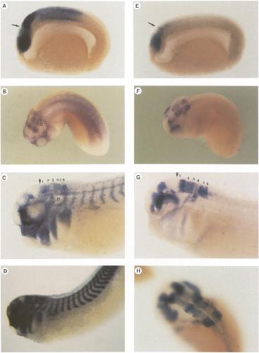 (G) Anterior part of a stage 31 embryo, arrow indicates anterior border of hindbrain, rhombomeres are numbered. (H) Dorsal view of the head of a