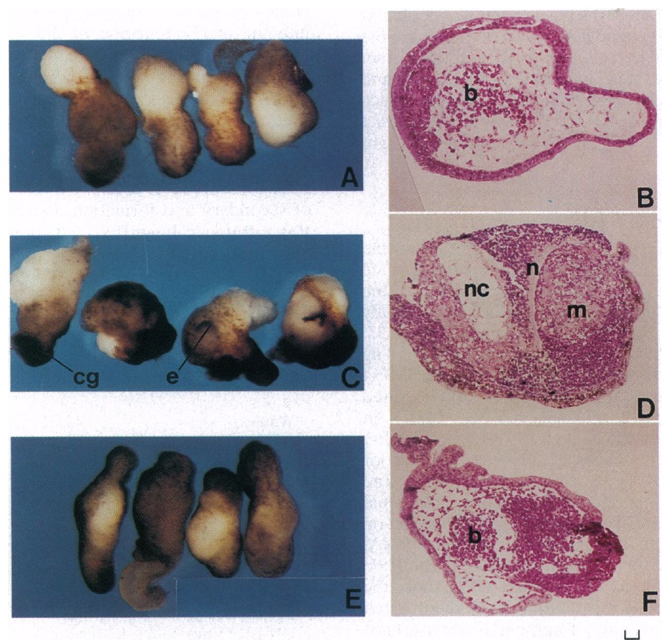 a dorsal-like phenotype including an eye-like capsule (e) and a cement gland (cg) (C) and notochord (nc), muscle (m), and neural tissue (n) (D).