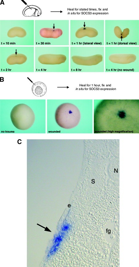 Figure 3. Suppresor of cytokine signaling-3 (SOCS3) expression is rapidly induced after epithelial wounding. A: Embryos were subjected to superficial epithelial wounds, allowed to heal for the stated times (0â8 hr) and then subjected to in situ hybridization using a SOCS3 antisense riboprobe. SOCS3 is first evident at 30 min after trauma and is maximal at 1 hr. The wound-induced expression of SOCS3 is transient and dramatically down-regulated 2 hr after trauma and is undetectable by 8 hr after trauma. B: SOCS3 is rapidly induced after trauma at early stages of embryonic development. Embryos at the gastrula stage (stage 11) were wounded and allowed to heal for 1 hr before fixation and in situ hybridization for SOCS3 expression. C: SOCS3 expression is induced in the epidermis and underlying tissues after trauma. Cross-section (8 μm) of a stage 28 embryo after wounding, healing for 1 hr, and then analyzed for SOCS3 expression by in situ hybridization. SOCS3 expression (blue staining) in evident in the epidermis and the underlying tissues. Arrow indicates the site of wounding, and the parallel dotted lines indicate the depth of the epidermal layer. Original magnification, Ã200. N, notochord; S, somite; fg, foregut; e, epidermis. Download figure to PowerPoint