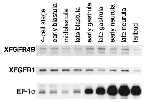 mRNA expression was compared with that of XFGFR1. EF-1a was used as internal control. XFGF4B mRNA is detected