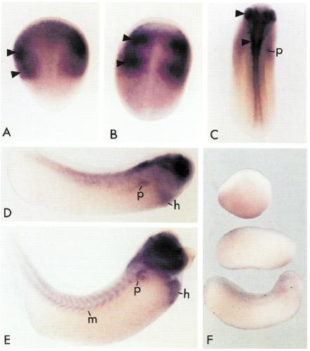 Besides neural expression, XFGFR4B mRNA is detected in pronephros (p) heart (h) and myotomes (m) (D,E). Developing