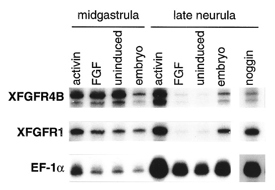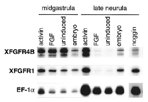 treated with activin or expressing noggin continue to express XFGFR4B and XFGFR1 at a similar level while their