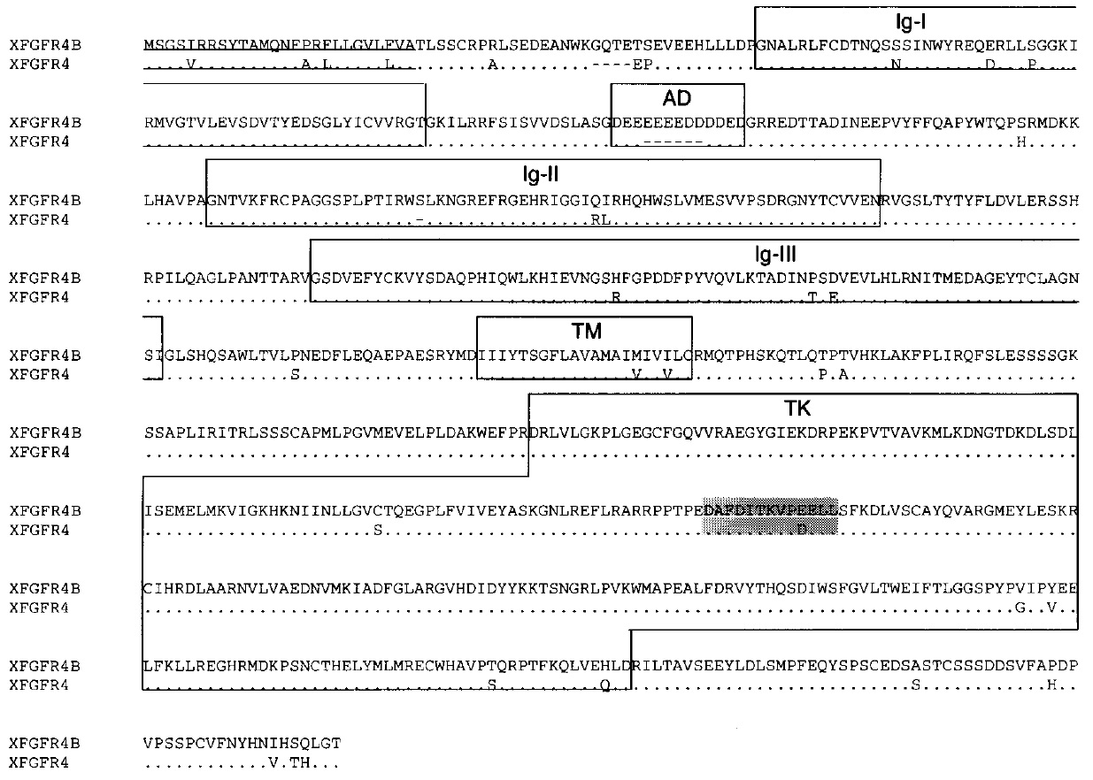 FIG. 1. Comparison of predicted amino acid sequences from XFGFR4B and XFGFR4. Dashes represent gaps in the