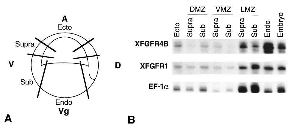 are expressed in every tissue. A high level of XFGFR4B expression was detected in the endoderm. A, Animal Pole; D,