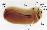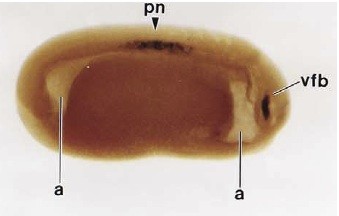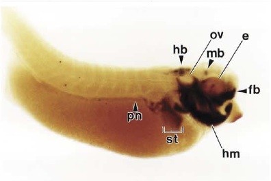 Key: cnh = chordoneural hinge, pn= pronephric mesechyme, hb = rhombomere of hindbrain, mb= midbrain, vfb= ventral forebrain, dfb= diencephalon, hm=hyoid and mandibular crest
