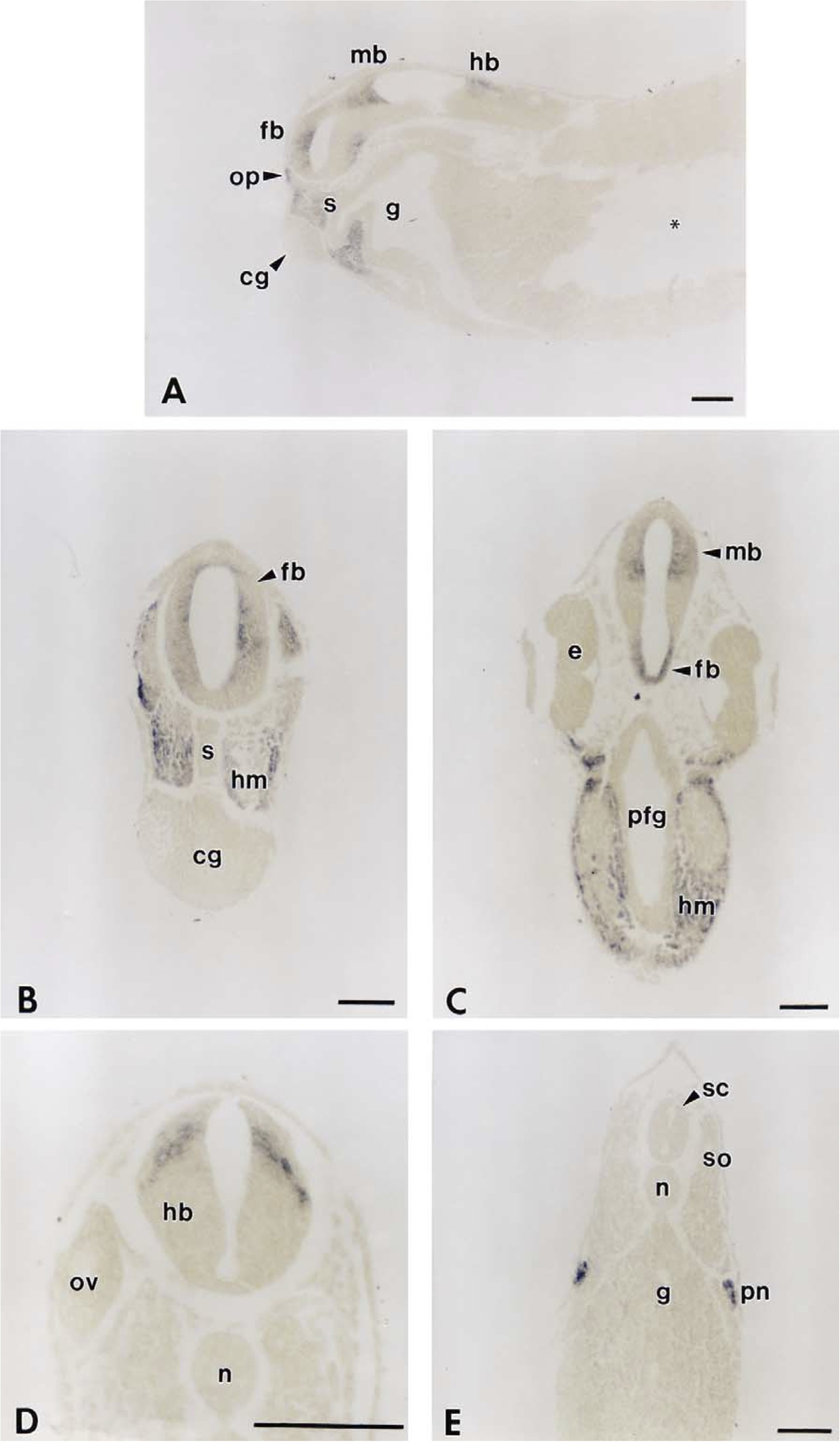 Fig. 4. Sections of whole mount stage 28 embryo analyzed for Evi-1 expression by whole mount in situ hybridization. Panel (A): sagittal section, anterior to left. Panels (B): transverse sections through planes indicated in Fig. 1(C). The asterisk indicates an area of yolky endoderm lost during sectioning. Scale bar: 100 mm. Abbreviations: cg, cement gland; e, eye; fb, forebrain; g, gut cavity; hb, hindbrain; hm, head mesenchyme; mb, midbrain; n, notochord; op, olfactory placode; ov, otic vesicle; pfg, pharynx/foregut; pn, pronephric duct; s, stomodeal anlage; sc, spinal cord; so, somite.