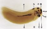 Fig. 3. Whole mount RNA in situ localization of Evi-1 transcripts during Xenopus development. Anterior is to the right in all panels. Representative cleared embryos of increasing age are shown (A) stage 22, (B) stage 25, (C) stage 28, (D) stage 37. Transverse section planes, Fig. 4(B)E), are indicated by the vertical labeled lines (C). Note in panel (D) the avoidance of the otic vesicle by Evi-l expressing neural crest cells. Faint Evi-l signal is visible over a localized region of the developing foregut in later tadpoles, tentatively identified as the stomach (D). Comparison of Pax8 and Evi-1 expression patterns at stage 23 indicates staining in the pronephric duct anlage (E). Scale bar: 100 mm. Abbreviations: a, archenteron (developing gut cavity); cg, cement gland; cnh, chordoneural hinge; dfb, dorsal forebrain; e, eye, hb, hindbrain; hm, head mesenchyme; mb, midbrain; op, olfactory placode; ov, otic vesicle; pn, pronephric duct; st, developing stomach; vfb, ventral forebrain.
