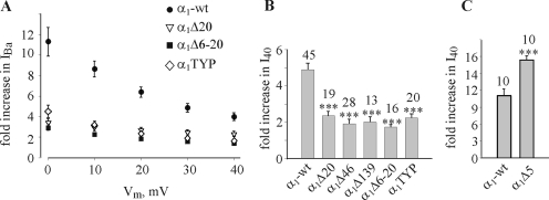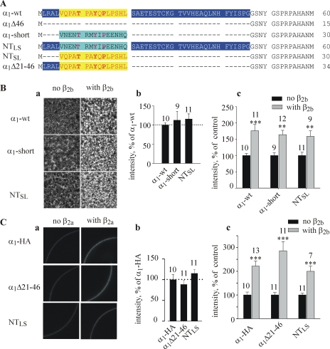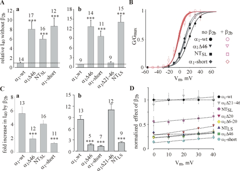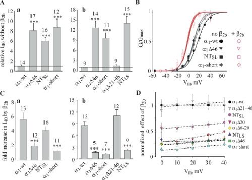 beta subunits (Ca(v)beta) increase macroscopic currents of voltage-dependent Ca2+ channels (VDCC) by increasing surface expression and modulating their gating, causing a leftward shift in conductance-voltage (G-V) curve and increasing the maximal open probability, P(o,max). In L-type Ca(v)1.2 channels, the Ca(v)beta-induced increase in macroscopic current crucially depends on the initial segment of the cytosolic NH2 terminus (NT) of the Ca(v)1.2alpha (alpha1C) subunit. This segment, which we term the "NT inhibitory (NTI) module," potently inhibits long-NT (cardiac) isoform of alpha1C that features an initial segment of 46 amino acid residues (aa); removal of NTI module greatly increases macroscopic currents. It is not known whether an NTI module exists in the short-NT (smooth muscle/brain type) alpha(1C) isoform with a 16-aa initial segment. We addressed this question, and the molecular mechanism of NTI module action, by expressing subunits of Ca(v)1.2 in Xenopus oocytes. NT deletions and chimeras identified aa 1-20 of the long-NT as necessary and sufficient to perform NTI module functions. Coexpression of beta2b subunit reproducibly modulated function and surface expression of alpha1C, despite the presence of measurable amounts of an endogenous Ca(v)beta in Xenopus oocytes. Coexpressed beta2b increased surface expression of alpha1C approximately twofold (as demonstrated by two independent immunohistochemical methods), shifted the G-V curve by approximately 14 mV, and increased P(o,max) 2.8-3.8-fold. Neither the surface expression of the channel without Ca(v)beta nor beta2b-induced increase in surface expression or the shift in G-V curve depended on the presence of the NTI module. In contrast, the increase in P(o,max) was completely absent in the short-NT isoform and in mutants of long-NT alpha1C lacking the NTI module. We conclude that regulation of P(o,max) is a discrete, separable function of Ca(v)beta. In Ca(v)1.2, this action of Ca(v)beta depends on NT of alpha1C and is alpha1C isoform specific.