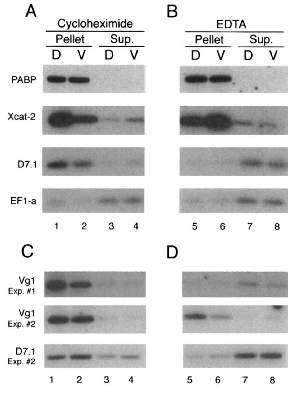 Maternal mRNAs are synthesized during oogenesis and often stored for use during early embryogenesis, before the onset of zygotic transcription. The temporal and spatial regulation of maternal RNAs is likely to be crucial mechanism for the establishment of the body pattern. In the course of a study that identified a Xenopus maternal mRNA that is translationally regulated along the dorsoventral axis, several RNAs were found to behave anomalously in polysomal analysis and are further characterized here. As controls for polysome analysis, elF4E RNA and D7.1 RNA were equally translated in both dorsal and ventral cells, whereas the cell-cell signaling factor noggin RNA was not translated in either cell type. Maternal RNAs encoding poly (A) binding protein (PABP), Vg1 and Xcat-2 were associated with large complexes that, in contrast to polysomes, were not dissociated in magnesium-free buffer. Vg1 and Xcat-2 maternal mRNAs have been shown to be localized during oogenesis to the vegetal hemisphere of the oocyte [Rebagliati et al., 1985; Mosquera et al., 1993]. In situ hybridization analysis indicated that PABP RNA was also localized during oogenesis, to the animal hemisphere in stage VI oocytes. This suggests that association of maternal mRNAs with large EDTA-insensitive mRNP complexes is correlated with intracellular localization, but the specific localization within the oocyte is dependent upon the RNA species.