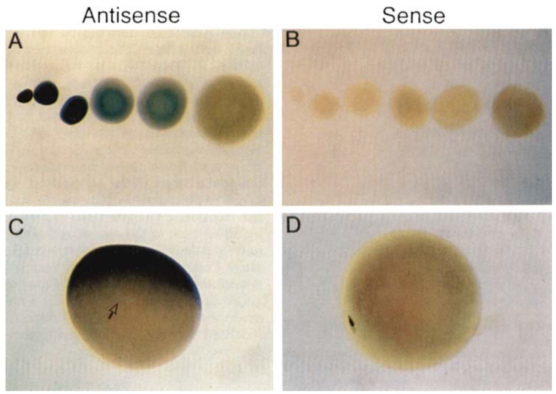 open arrow. D. Stage VI oocyte, hybridized with a control sense probe