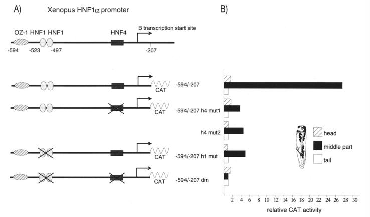 and HNF4 are given (see Zapp et al., 1993). Mutated binding sites are marked by a cross. (B) The relative CAT activity of the various injected promoter
