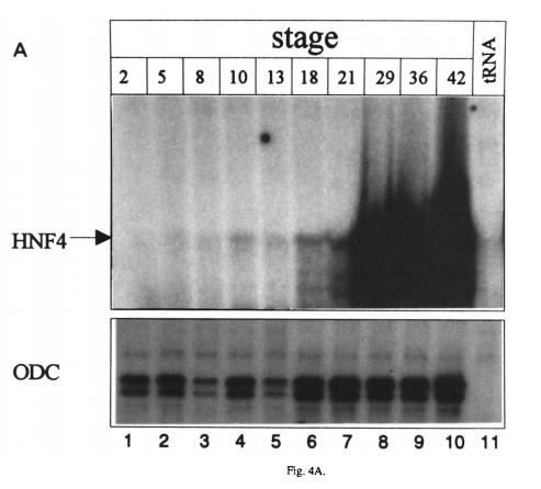 amounts of HNF4 mRNA in early embryonic stages. The lower part shows an RNase protection experiment using a probe for the omithine decarboxylase