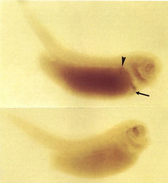 containing HNF4 RNA present in the pronephros (arrowhead) liver and gut (arrow) am stained blue. A control larvae hybridized with a sense probe is