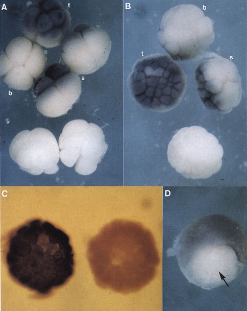 64-cell stage embryo from the top (t), bottom (b) and side (s) view. One control embryo is shown in the lower part. (C) One embryo shown in (B) from