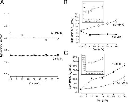 Figure 2. . Voltage dependence of the two components of external TEA block. (A) The fraction of current block by external TEA with high affinity (the parameter A in Eq. 2) at 50 mM (○) and 5 mM (▪) internal K+. (B) The Kapphigh value from Eq. 2 determined in 50 mM (○) and 5 mM (▪) internal K+. (C) The Kapplow value from Eq. 2 determined in 50 mM (○) and 5 mM (▪) internal K+. Insets: Kapphigh and Kapplow values obtained at negative potentials from block of current tails with an activation voltage of +20 mV (see materials and methods). The values at +20 mV were from block of steady-state current during the activation pulse.