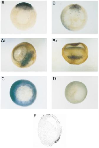 the dorsal mesoderm. (B) At early gastrula (stage 10.25), vegetal view; dorsal is up. (B1) Dorsal view. Staining is restricted to the top of