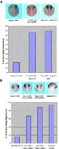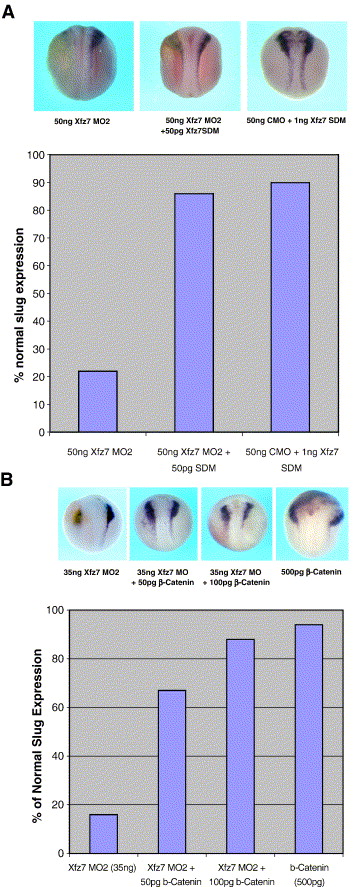 Fig. 7. Xfz7 MO-mediated downregulation of neural crest induction can be rescued by Xfz7 and β-catenin. Embryos were injected at the 2-cell stage with MO and RNA in the animal pole of one blastomere. The MOs used were Xfz7MO (A and B) and Co MO (A). RNAs used were Xfz7 SDM (A) and constitutively active β-catenin (B). (A) Xfz7 MO on its own gives 22% embryos showing normal slug expression (n = 27). Xfz7 MO plus 50 pg Xfz7SDM gives 86% normal slug expression (n = 29). 50 ng Co MO plus 1 ng Xfz7 SDM results in 90% of embryos having normal slug expression (n = 27). (B) 35 ng Xfz7MO gives 16% of embryos showing normal slug expression (n = 29). Xfz7MO plus 50 pg β-catenin and 100 pg β-catenin gives embryos showing increasingly normal slug expression (67% and 88%, respectively, n = 29 and 34). 500 pg β-catenin on its own gives 94% of embryos with normal or increased slug expression (n = 29). All injections contained the lineage tracer β-galactosidase (250 pg).