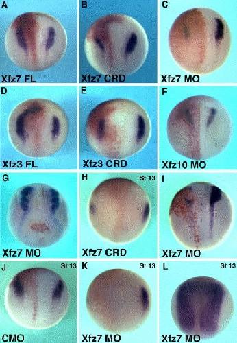 Fig. 4. Analysis of Xfz7 function in neural crest formation in whole embryos. Embryos were injected with RNA or MO at the 2-cell (AâF), 8-cell (G, H, JâL) or 16-cell stage (I) into the animal pole region of one blastomere except for (G) where the embryo was injected twice into the DMZ. RNA's or MO's used were: (A) Xfz7 full-length (1 ng), (B) Xfz7CRD (1 ng), (C) Xfz7MO (35 ng), (D) Xfz3 full-length (1 ng), (E) Xfz3CRD (1 ng), (F) Xfz10MO (50 ng), (G) Xfz7MO (60 ng), (H) Xfz7CRD (500 pg). (I) Xfz7MO (40 ng) into the D1.2 blastomere, (J) CMO (35 ng), (K) Xfz7MO (35 ng), (L) Xfz7MO (35 ng). All injections contained the lineage tracer β-galactosidase (250 pg). Thus, the red nuclear β-galactosidase staining indicates the injected side. The dark purple indicates Xslug expression except (L) where it is sox2 expression. All embryos are stage 18 except for panels H, JâL which are stage 13. All embryos are dorsal views with anterior to the top.
