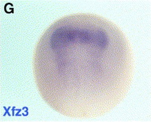 fzd3 (frizzled 3) gene expression in Xenopus laevis embryo, NF stage 13, assayed via in situ hybridization, dorsal view, anterior up.