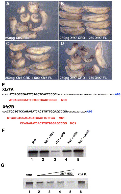 Fig. 2. Xfz7 is important for convergent extension movements. (A) injection of 250Â pg of Xfz7 CRD leads to boat shape embryos typical of defects in convergent extension movements. (B) Co-injection of 250Â pg Xfz7 CRD and 250Â pg Xfz7. Full-length leads to normal looking embryos. (C and D) Injection of increasing concentrations of Xfz7 leads to increasing convergent extension defects. (E) Diagram showing the binding sites for MO1, 2 and 3 to Xfz7A (Wheeler and Hoppler, 1999) and Xfz7B (Medina et al., 2000 and Sumanas et al., 2000). (F and G) mRNA and protein were prepared from Xfz7 plasmid using an in vitro transcription translation system. 35S-labeled translation products were analyzed on SDSPAGE gels. (F) Translation of Xfz7 RNA (lane 1) was decreased in the presence of MO2 (lane 3) but not by MO1 (lane 2), MO3 (lane 4) and control MO (lane 5). The results shown are representative for at least 3 independent experiments. (G) Translation of Xfz7 RNA was decreased as the amount of MO2 was increased. Lane 1, control MO, lanes 2â5, 20, 40, 60 and 80Â ng MO2, lane 6, Xfz7 on its own.