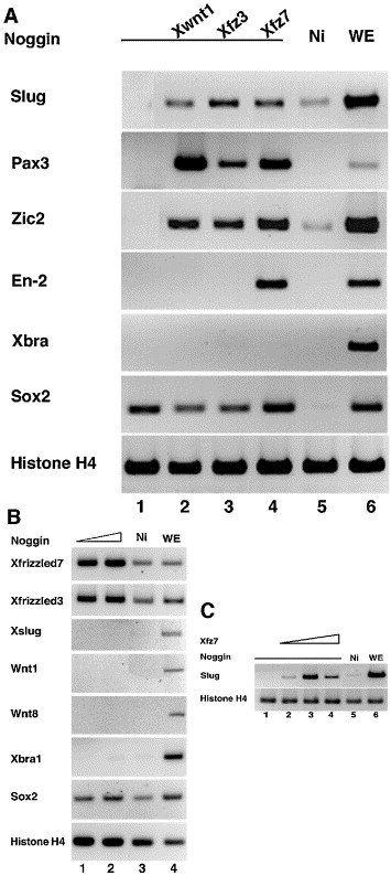 Fig. 3. Xfz7 induces neural crest markers in animal caps. (A) Xfz7 induces the same neural crest markers as Xwnt1 and Xfz3 shown by RT-PCR analysis of animal caps expressing noggin (500Â pg) alone (lane 1) or with Xwnt1 (100Â pg, lane 2), Xfz3 (1Â ng, lane 3) or Xfz7 (500Â pg, lane 4). (B) 500Â pg and 750Â pg of noggin injected into animal caps induces expression of Sox2, Xfz7 and Xfz3 but not Xslug, Wnt1, Wnt8 and Xbra1 (lanes 1 and 2) compared with the non-injected control (Ni, lane 3). WE in lane 4 stands for whole embryo. (C) RT-PCR analysis of slug expression is shown for animal caps injected with noggin (500Â pg) alone (lane 1) or with increasing amounts of Xfz7 250Â pg (lane 2), 500Â pg (lane 3), 1Â ng (lane 4). âNiâ indicates animal cap from uninjected embryo and âWEâ indicates RNA made from whole embryos at stage 19.