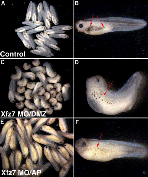Fig. 6. Downregulation of Xfz7 expression leads to the loss of melanocytes in whole embryos. (A and B) Control embryos. The arrows show the neural crest derived melanocytes concentrated in the trunk. (C and D) Injection of Xfz7 MO (60Â ng) into the DMZ of a 4-cell stage embryo results in decreased melanocytes (arrow) and morphogenetic defects. (EâF) Injection of Xfz7 MO (60Â ng) into the animal pole region of both blastomeres of a 2-cell stage embryo results in absent melanocytes (arrow).