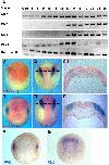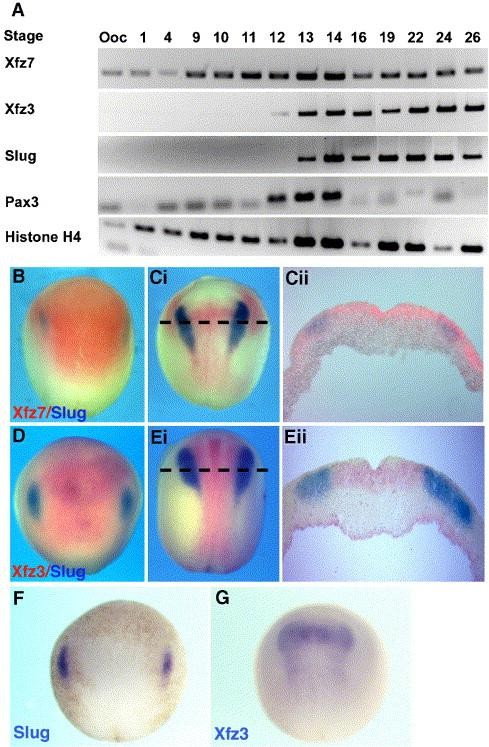 Fig. 1. Xfz7 rather than Xfz3 is expressed in the early neural crest. (A) Embryos were harvested at the stages indicated and expression of Xfz7, Xfz3, Slug and Pax3 was assessed by RT-PCR. Histone H4 was used as a loading control. (BâE) Double label in situ expression of Xfz7 and Xfz3 with Xslug at early neurula (stage 13, B and D) and late neurula stage (stage 18, Ci and Ei). Xfz7 and Xfz3 (red) and Slug (purple). Cii and Eii are frozen sections cut at the level shown in panels Ci and Ei. (F and G) Wholemount in situ expression of panels F slug and G Xfz3 on stage 13 embryos.