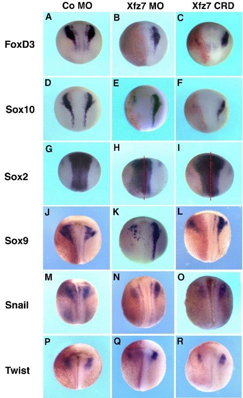 Fig. 5. Loss of Xfz7 function leads to downregulation of neural crest gene expression in whole embryos and expansion of neural gene expression. Embryos were injected at the 2-cell stage (except K, 8 cell stage) with RNA in the animal pole of one blastomere. MOs or RNA' used were standard control MO (60 ng) (A, D, G, J, M, P), Xfz7MO (60 ng except (K) 40 ng) (B, E, H, N, Q) and Xfz7CRD (1 ng) (C, F, I, L, O, R). All injections contained the lineage tracer β-galactosidase (250 pg). Thus, the red nuclear β-galactosidase staining indicates the injected side. The dark purple indicates the expression of FoxD3 (AâC), Sox10 (DâF), Sox2 (GâI), Sox9 (JâL), Snail (MâO) and Twist (PâR). All embryos are dorsal views with anterior to the top. The dashed line in panels H and I indicates the embryonic midline.