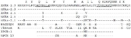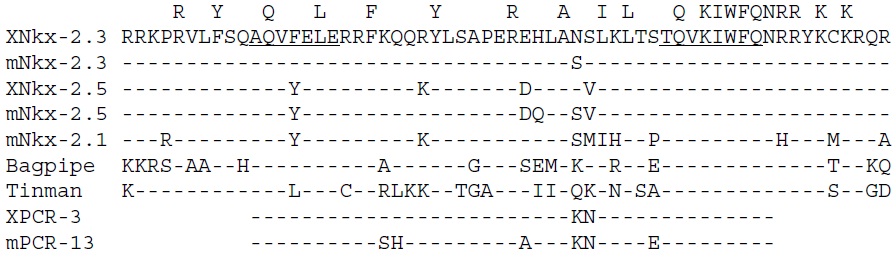 aligned to that of XNkx-2.5. The homeobox domain is boxed. A decapeptide conserved in
