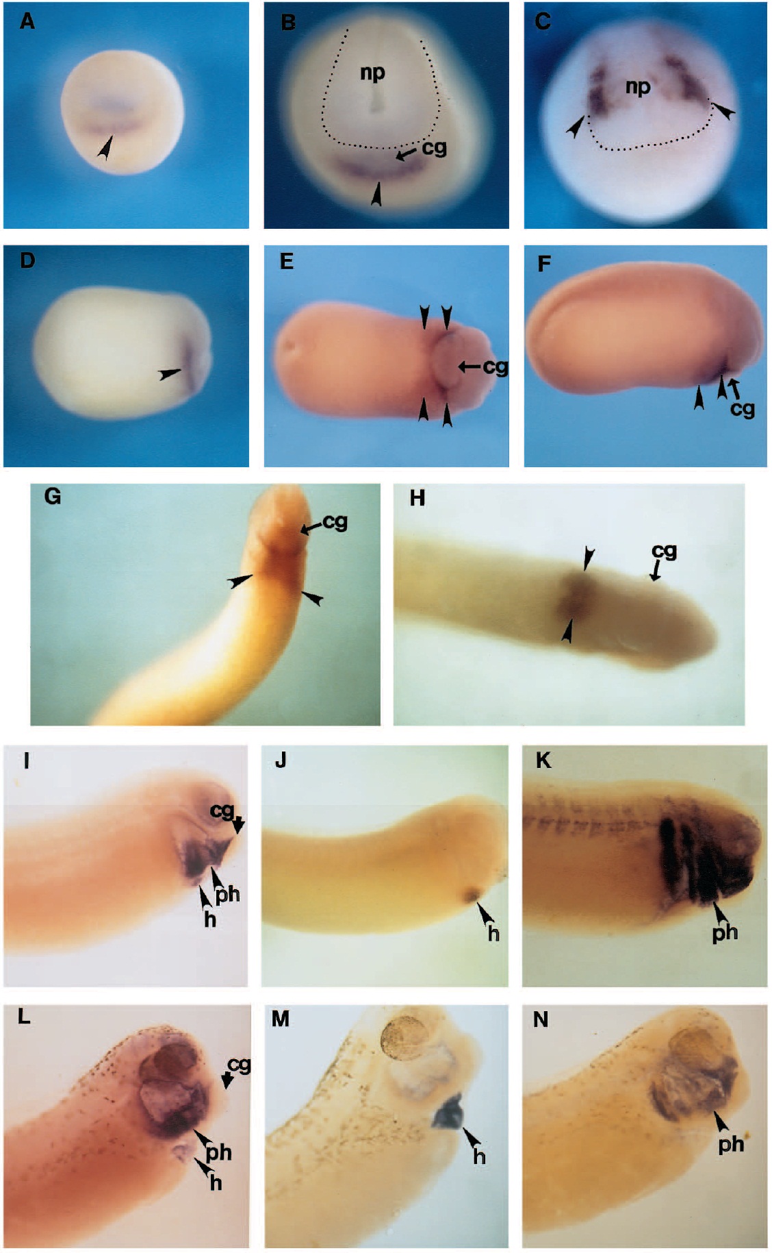 staining remains in the pharyngeal region, and is absent from the heart. Embryos shown in I, K-N were cleared in benzyl:benzoate (Harland,