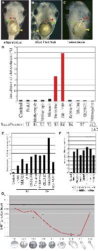 (E) Exposure to several different blockers of R3 and R4 also randomized laterality, confirming their role in LR asymmetry. Each error bar is 50% of the standard deviation above and below the datapoint.
