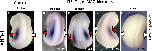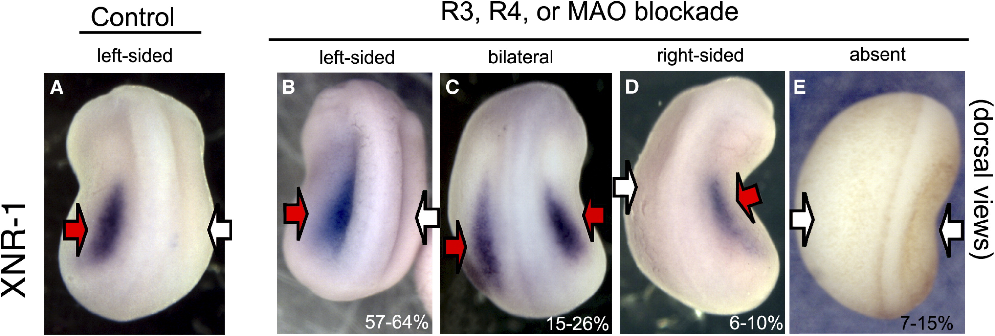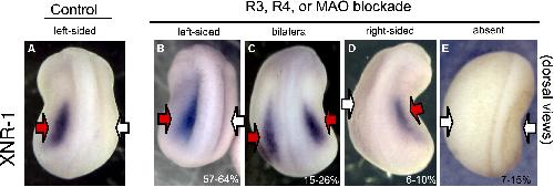 Embryos were exposed to blockers of R3 or R4 during early stages and processed for in situ hybridization with the laterality markers XNR-1 and Xlefty. Embryos exposed to vehicle only (controls) exhibited the normal left-sided pattern of XNR-1 (A) expression. In contrast, embryos in which the activity of MAO, R3, or R4 was inhibited exhibited bilateral (C), right-sided (D), or absent (E) expression of XNR-1 in addition to the left-sided expression (B). This effect was statistically significant (see numerical data and analysis in Table S9). Red arrows indicate regions of expression; white arrows indicate lack of expression.