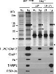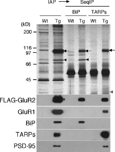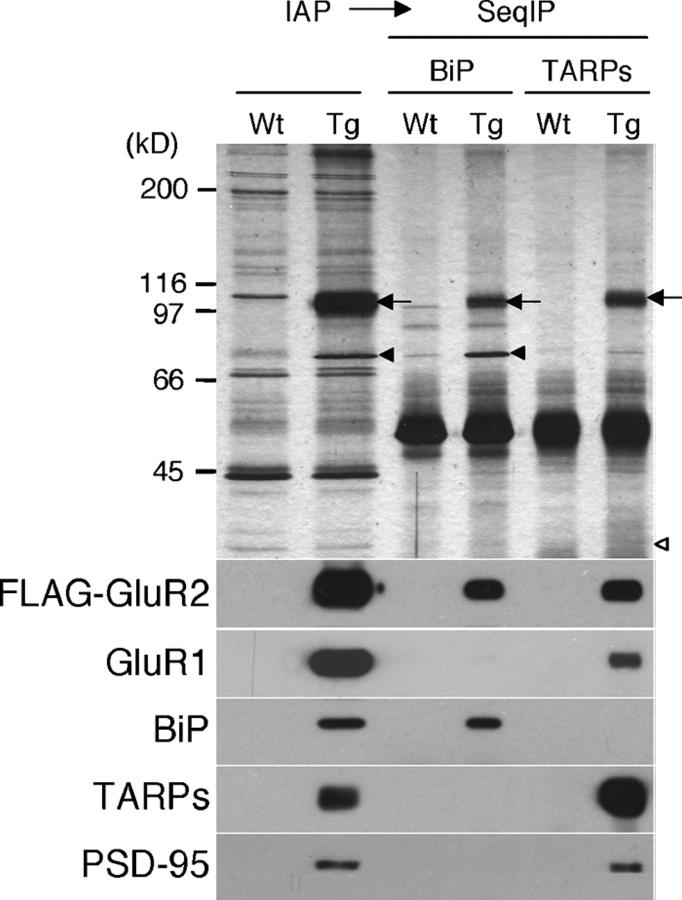 Figure 4. Two distinct AMPAR complexes. Immunoaffinity-purified brain AMPAR complexes (IAP) were reprecipitated (seqIP) with antibodies to either BiP or TARPs and analyzed by silver staining (top) and immunoblotting with the indicated antibodies (bottom). The BiP reprecipitation isolates 110- (arrow) and 78-kD (closed arrowhead; BiP) proteins; the TARP reprecipitation isolates 110- and 35-kD (open arrowhead; TARPs) proteins. The BiP reprecipitates include only GluR2, but not GluR1, TARPs, or PSD-95, whereas TARP reprecipitates include GluR1 and PSD-95 in addition to GluR2.