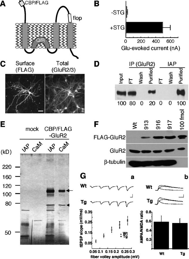 Figure 2. Functional expression of CBP/FLAG-GluR2 in heterologous cells and in transgenic mouse brain. (A) Schematic presentation of CBP/FLAG-GluR2. Calmodulin-binding peptide (CBP) and FLAG peptide sequences were inserted after the signal sequence of mouse GluR2 (flop form edited at position 586 (Q/R)). (B) In X. laevis oocytes expressing CBP/FLAG-GluR2, glutamate-evoked currents were vastly increased by coexpression of stargazin cRNA. (C) Surface receptors expressed in hippocampal neurons were live labeled with anti-FLAG M2 and total GluR2 was stained with anti-GluR2/3. Bar, 20 μm. (D) More efficient isolation of CBP/FLAG-GluR2 by immunoaffinity purification (IAP; anti-FLAG M2 agarose) than by conventional immunoprecipitation (anti-GluR2 antibody). Almost 100% of solubilized CBP/FLAG-GluR2 was isolated by IAP. FT, flow-through. (E) Two-step purification of CBP/FLAG-GluR2. The extracts of HEK cells transfected with mock vector or CBP/FLAG-GluR2 were subjected to sequential affinity chromatography: IAP and calmodulin-affinity chromatography (CaM). The arrow indicates the 110-kD protein (CBP/FLAG-GluR2). The arrowhead indicates the copurified 78-kD protein (identified as BiP/Grp78 by mass spectrometry). (F) Whole brain extracts (50 μg) from the indicated transgenic mouse lines and 100 fmol of CBP/FLAG-GluR2 purified from HEK cells were probed with the indicated antibodies. CBP/FLAG-GluR2 represents ∼50% of the endogenous protein in line 917. (G) Basal synaptic transmission is normal in transgenic GluR2 mice. (a) Input–output curve for basal synaptic transmission in hippocampal slices from wild type (Wt; n = 16) and transgenic (Tg; n = 18) mice. Each point represents the mean ± SEM for each bin. Sample fEPSPs at different stimulus intensities are shown on top. Bars: (y-axis) 0.5 mV; (x-axis) 20 ms. (b) AMPA/NMDA ratios were calculated by evoking dual-component EPSCs (Wt, n = 5; and Tg, n = 9). Histogram represents the AMPA/NMDA ratio mean ± SEM. Sample traces of the mixed and isolated AMPA- and NMDA-mediated EPSCs from wild-type and transgenic mice are shown on top. Bars: (y-axis) 100 pA; (x-axis) 20 ms.