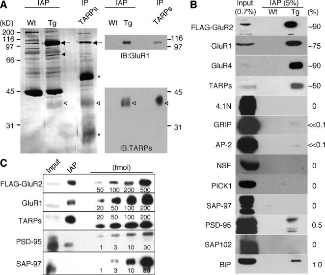 Figure 3. Quantitative association of TARPs with immunopurified AMPARs. (A) Gold colloidal total protein staining of immunoaffinity-purified CBP/FLAG-GluR2 (IAP) and immunoprecipitated TARPs (IP). The same preparations were also analyzed by Western blotting with anti-GluR1 or TARP antibody. The proteins with molecular masses of 110 (arrow), 78 (closed arrowhead), and 35 kD (open arrowhead) were detected in the transgenic mouse (Tg) but not in wild-type (Wt). 110- and 35-kD proteins were also detected in TARPs-IP, which correspond to AMPARs including GluR1 and TARPs, respectively. Asterisks denote the bands of IgG heavy and light chains. (B) IAP elution in A was immunoblotted with the indicated antibodies. The recovery (%) of each protein from input is indicated. (C) Quantitative binding of TARPs with AMPARs. For CBP/FLAG-GluR2, GluR1, and TARPs, input (1%) and purified AMPARs (IAP; 1%) from transgenic mouse brain were analyzed with the indicated amounts of purified CBP/FLAG-GluR2, HA-GluR1, and His6-stargazin COOH terminus. For PSD-95 and SAP-97, input (0.1%) and IAP elution (4%) were analyzed with purified PSD-95-GFP and SAP-97-GFP. These data are representative of five independent experiments.