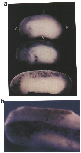 The arrow points to the anterior of the embryos. Control embryos hybridized with the sense strand xnfl probe did not show any specific hybridization