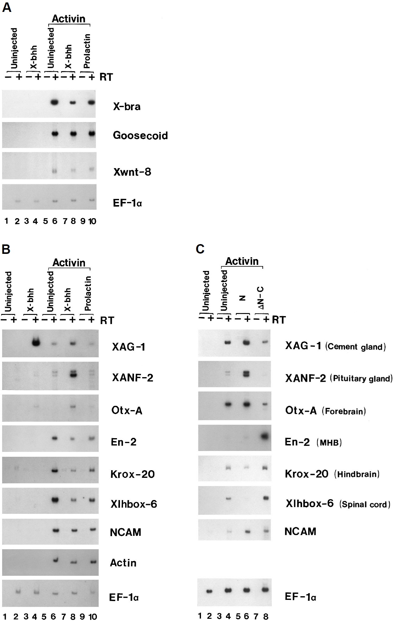 10 were treated with activin A. Note that no mesodermal markers are induced by X-bhh.