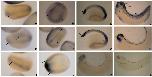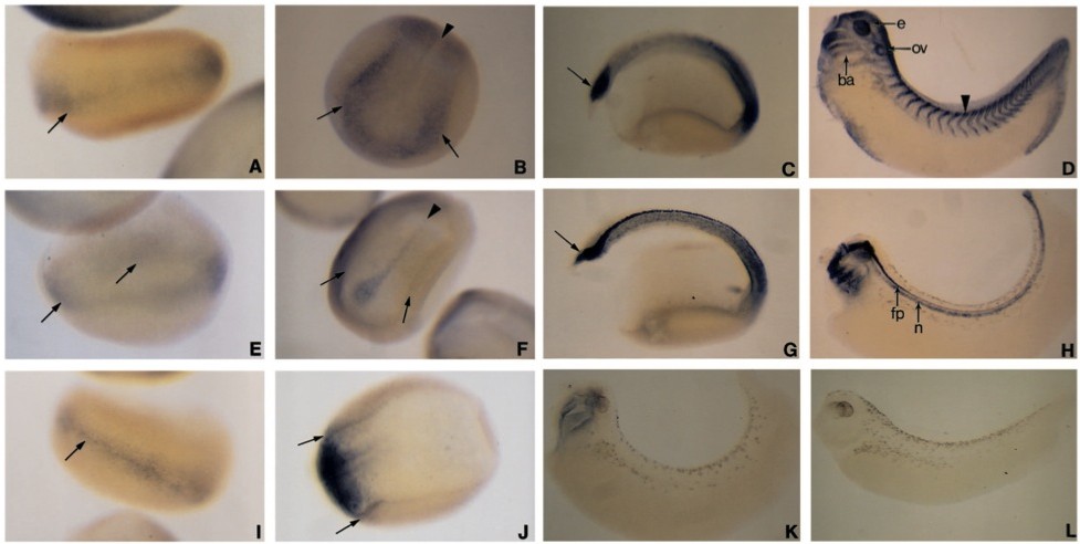 Fig. 2. Localization of X-hh transcripts during early development. Localizations of X-hh transcripts during development are revealed by in situ hybridization to embryos with antisense probes for X-bhh (A-D), X-shh (E-H), and X-chh (I-K). (A) Side view of an early gastrulaembryo (stage 10), with animal hemisphere up. X-bhh transcripts are localized to the sub-epithelial layer of the entire marginal zone (arrow). (B) Anterior view of a neurulaembryo (stage 14). X-bhh expression occurs throughout most of the neural plate, with strongest expression along the lateral border (arrows) and no expression along the midline (arrowhead). (C) Lateral view of a late neurulaembryo, after neural tube closure (stage 19/20). The most prominent domain of X-bhh expression is in the anterior of the embryo (arrow), with more diffuse expression observed posteriorly in the mesoderm. (D) Lateral view of a tailbudembryo (stage 28) with anterior toward the left. High levels of X-bhh transcripts are seen in specific structures of the head including the eye (e), otic vesicle (ov) and branchial arches (ba). X-bhh transcripts are also localized in a chevron-shaped band within each somite, predominantly within the dermatome (see text; data not shown). (E) Side view of an early gastrulaembryo (stage 10), with animal hemisphere up. X-shh transcripts are most prominent in the sub-epithelial layer of the entire marginal zone (the lower and upper arrows mark the dorsal and ventral sides of the embryo, respectively). With more extended incubation during the color reaction, lower level expression can be seen to extend over the animal hemisphere (not shown). (F) Anterior view of a neurulaembryo (stage 14). X-shh expression is restricted to the presumptive midline (arrowhead) and is absent from the rest of the neural plate (arrows). (G) Lateral view of a late neurulaembryo (stage 19/20) with anterior to the left. X-shh expression is in the notochord and ventral neural tube with the most prominent expression observed in an anterior domain (arrow). (H) Lateral view of a tailbudembryo (stage 29/30) with anterior toward the left. X-shh is expressed exclusively in cells of the notochord (n) and floorplate (fp) throughout the axis. Strong expression in the brain and other anterior structures persists. (I) Side view of an early gastrulaembryo (stage 10), with animal hemisphere up. X-chh expression extensively overlaps that of X-bhh and X-shh and is most prominent in a band of cells within the marginal zone (arrow). (J) Top view of a mid-neurulaembryo (stage 15/16) with anterior to the left. X-chh transcripts are most abundant in an extreme anterior domain of the embryo; the anterior portion of the neural plate is indicated by the arrows. (K) Lateral view of a tailbudembryo (stage 29/30) with anterior to the left. Low levels of X-chh transcripts are present in the pharyngeal cavity. (L) Side view of a tailbudembryo hybridized with a X-bhh sense probe as a control.